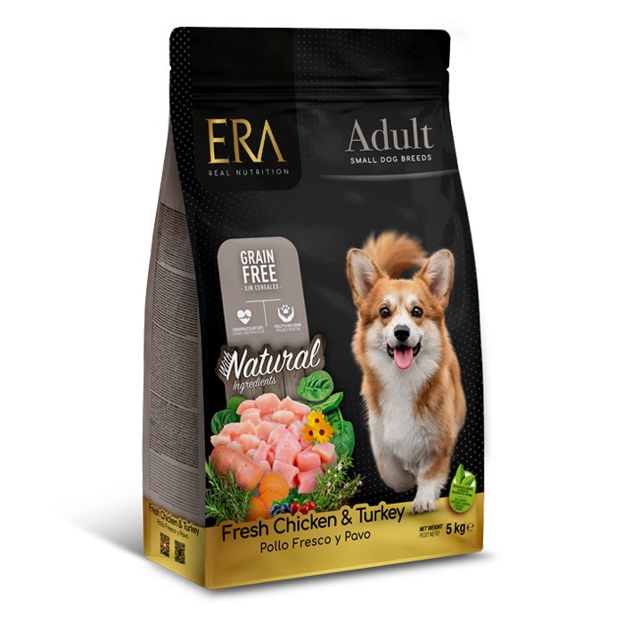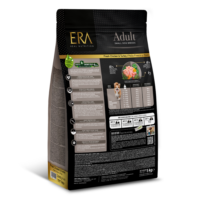 La gama ERA Grain-Free de pollo y pavo es exclusiva por su alta calidad, producción en un solo proceso térmico y la selección de ingredientes funcionales OptiImmuno+, que promueven la salud y el bienestar de tu perro.