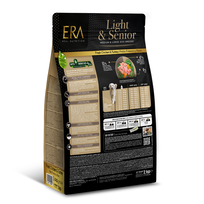 ERA Grain-Free Senior-Light Pollo y Pavo es un alimento grain-free completo y equilibrado para perros senior de raza Mediana/Grande(>10 kg). Su fórmula exclusiva, con un alto contenido en proteínas y una mezcla cuidadosa de ingredientes funcionales, promueve un crecimiento óptimo y saludable. Con un 53% de ingredientes de origen animal, incluyendo carne fresca de Pollo y carne de pavo deshidratada, esta receta es altamente digestible y sabrosa. Libre de cereales, es ideal para perros con alergias o intolerancias y para aquellos con sensibilidad estomacal. Además, contiene grasas y líquido natural apetitoso para un excelente sabor.